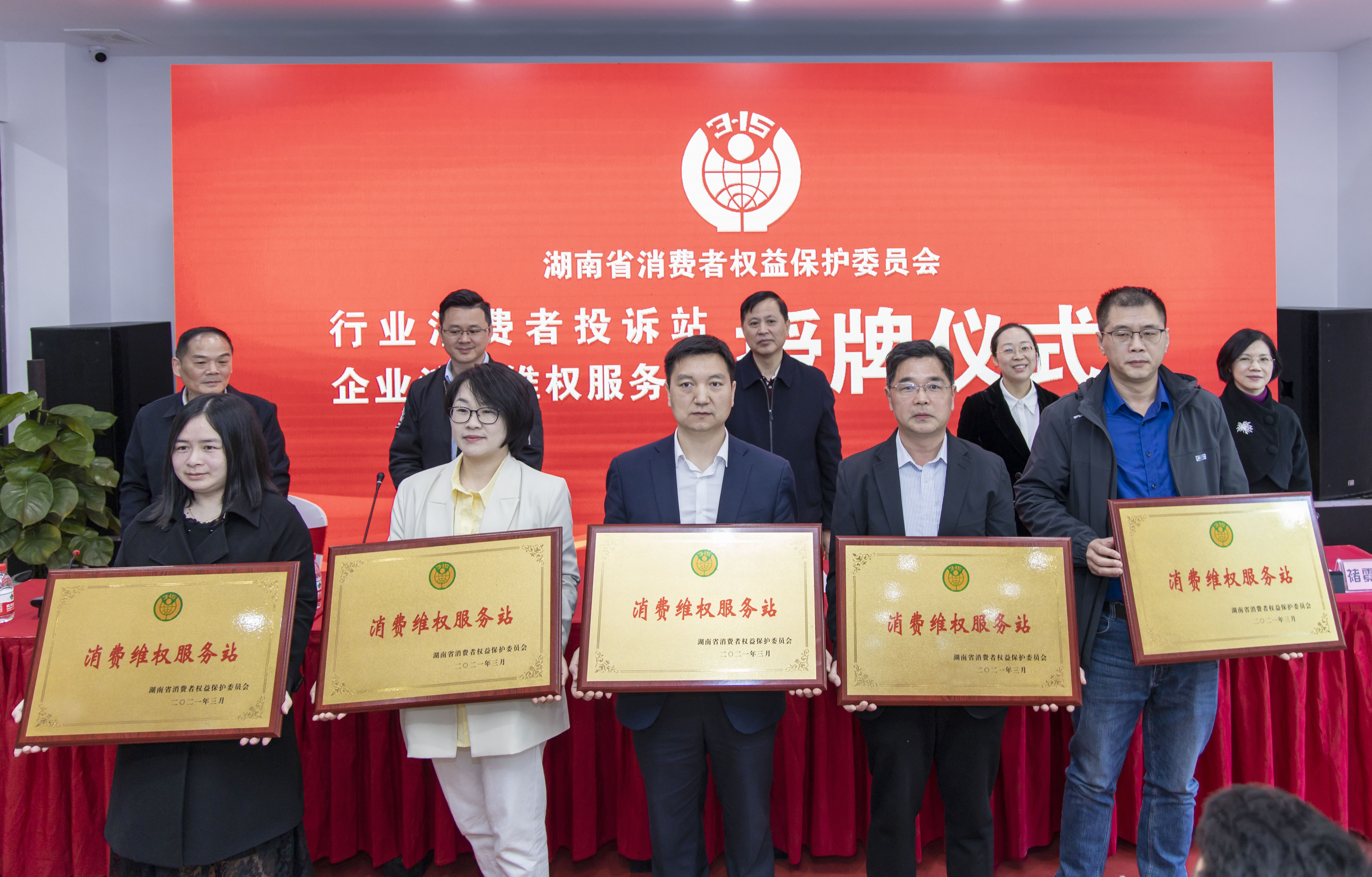 (3月25日,湖南省消保委為湘佳股份等10家企業頒發“消費維權服務站”牌匾。)