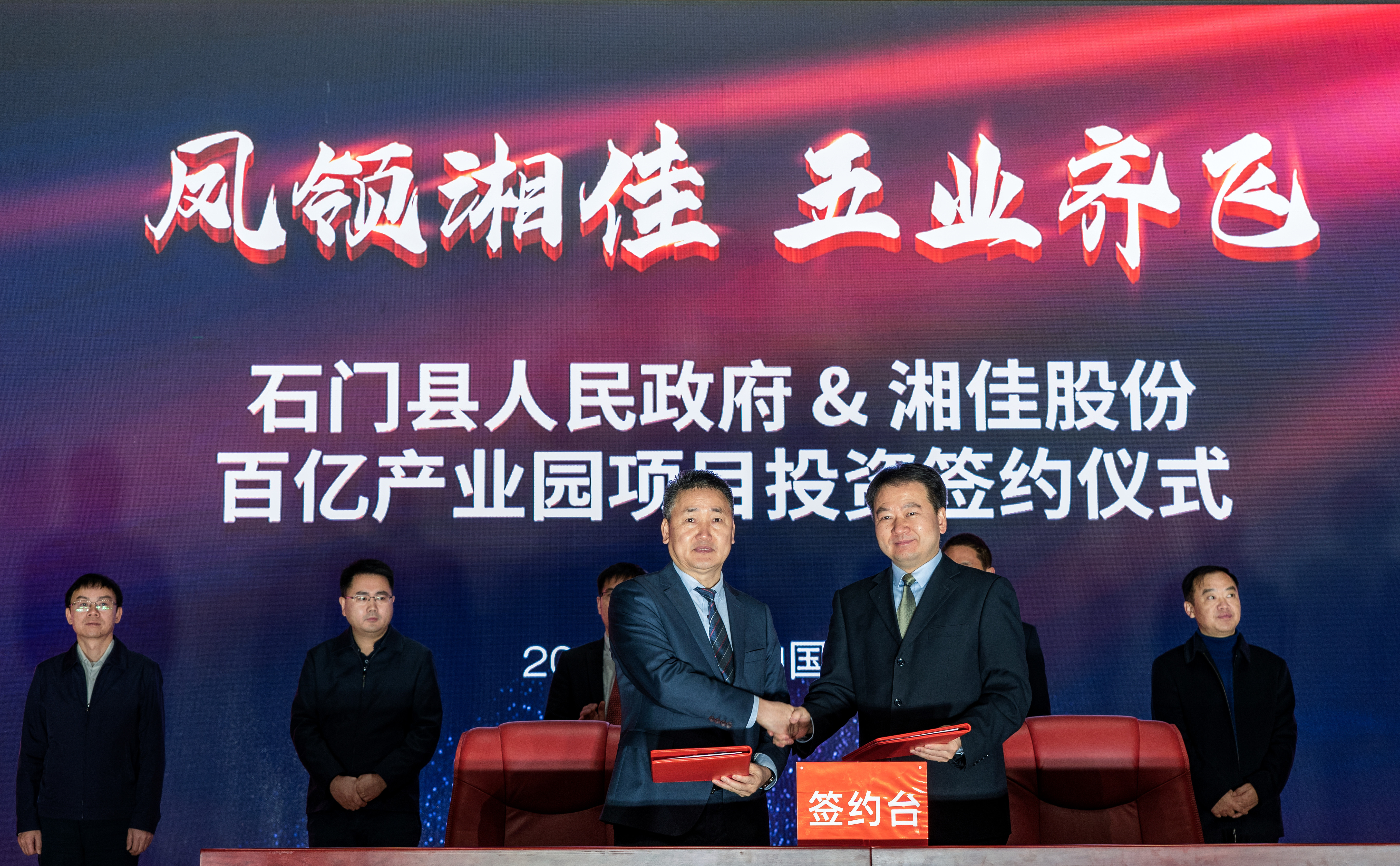 在簽約儀式上,石門縣人民政府縣長丁克剛與湘佳股份董事長兼總裁喻自文就湘佳美食心動智能工廠建設新項目和湘佳畜禽標準化養(yǎng)殖基地建設項目成功簽約。