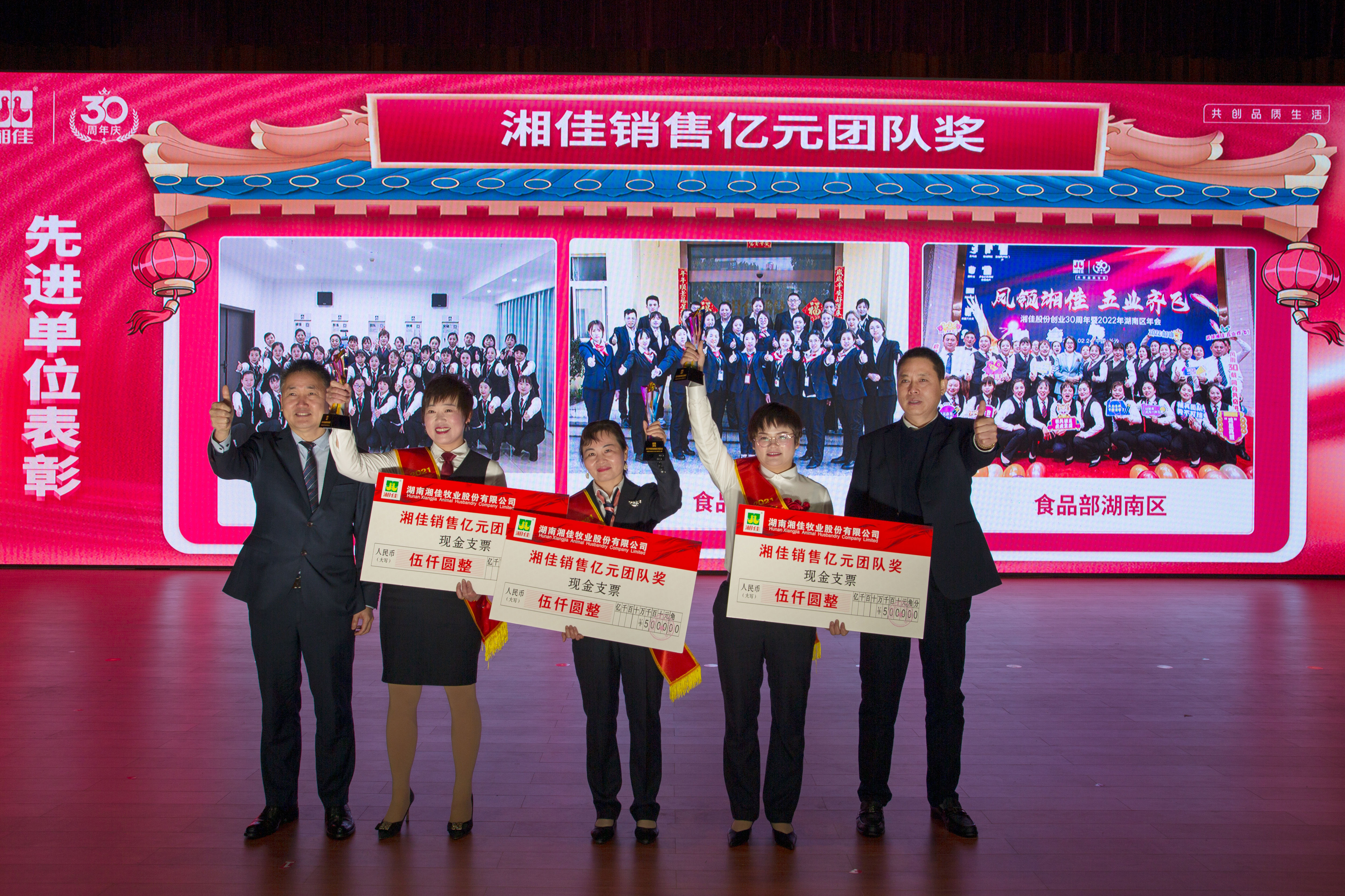 慶典現(xiàn)場,湘佳股份對山東泰淼、岳陽湘佳配貨部、總公司孵化部、總公司種禽部、食品部北京區(qū)、食品部湖南區(qū)、食品部山東區(qū)、食品部江蘇區(qū)、食品部河南區(qū)、食品部上海區(qū)、食品部結算部、湘佳食品產(chǎn)業(yè)園、三尖農(nóng)牧財務部、湘佳電商武漢區(qū)等15個優(yōu)秀團隊和75名優(yōu)秀干部進行了隆重表彰。