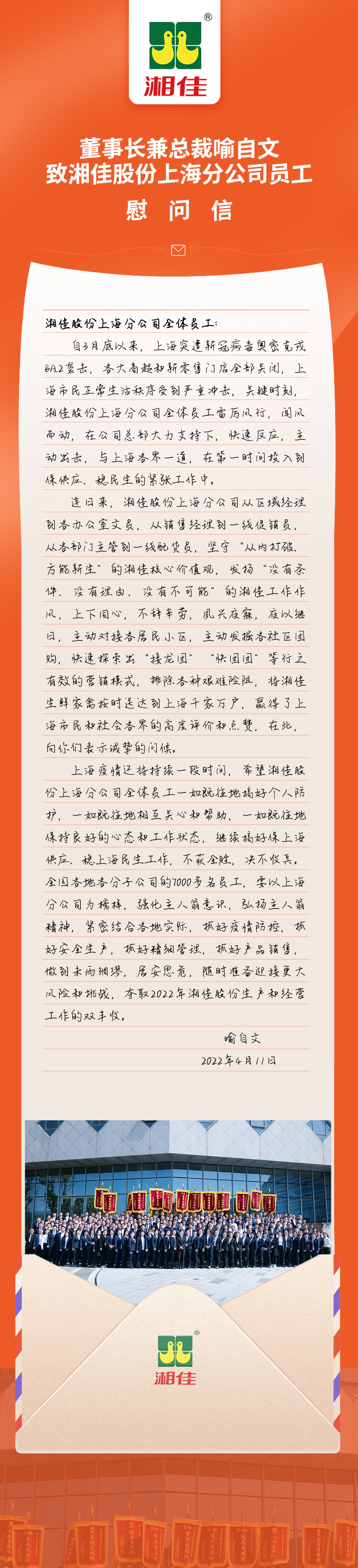 喻自文致湘佳股份上海分公司員工慰問信 發布人:文化部 發布日期:2022-04-11 5753次瀏覽 上一篇: 青春有我 筑夢湘佳|湘佳股份召開五四青年員工座談會 下一篇: 湘佳創業30周年慶祝大會:鳳領湘佳,五業齊飛