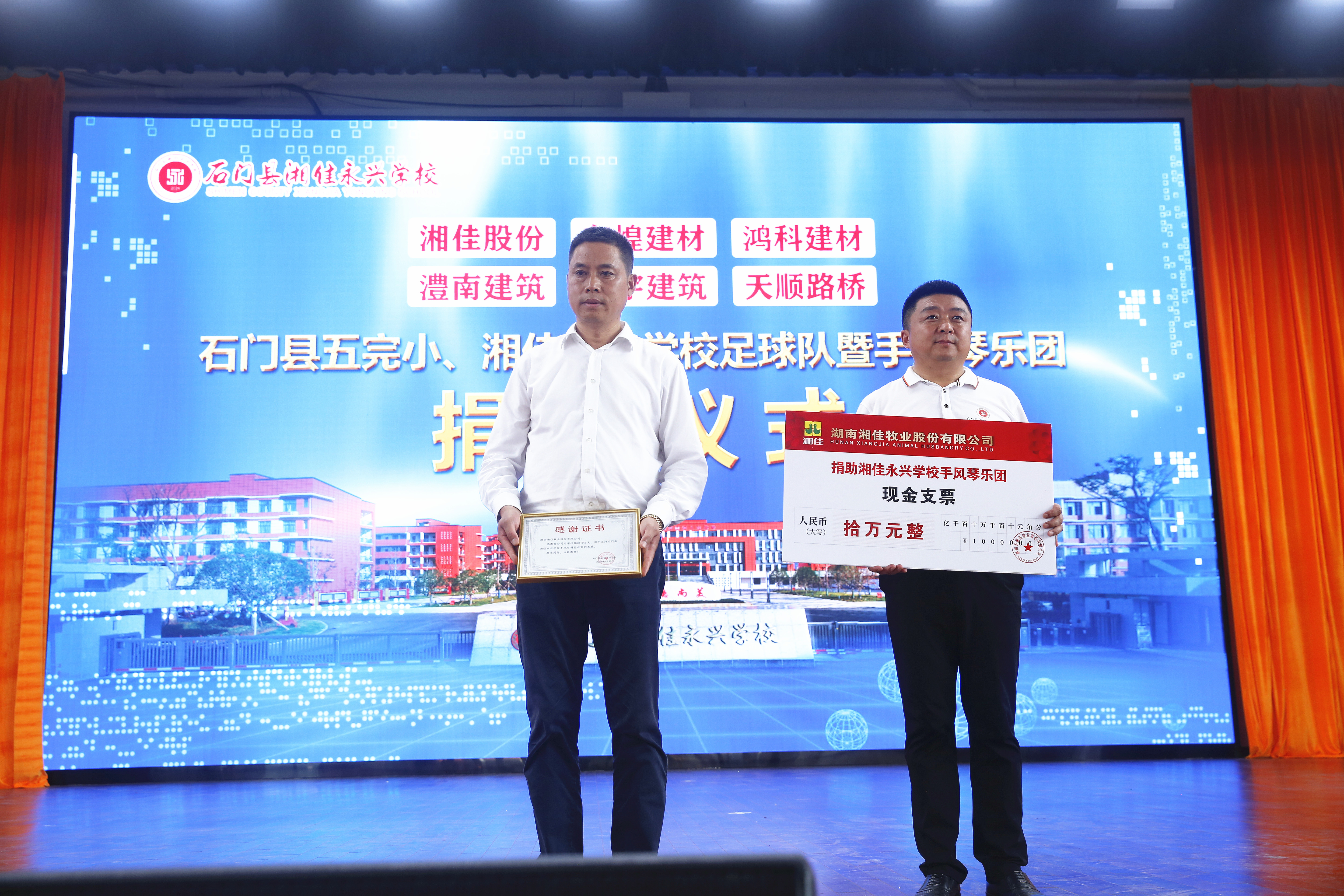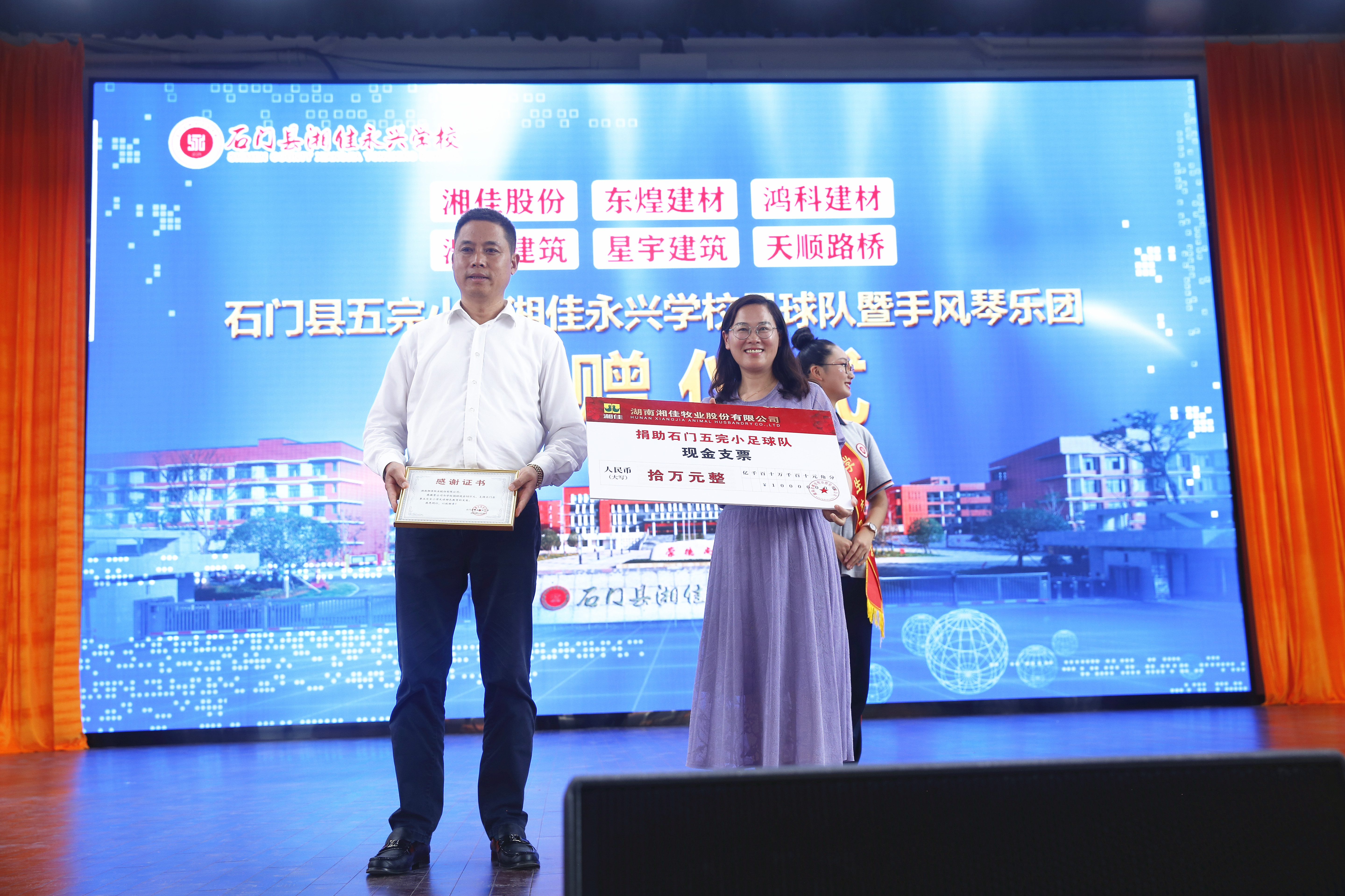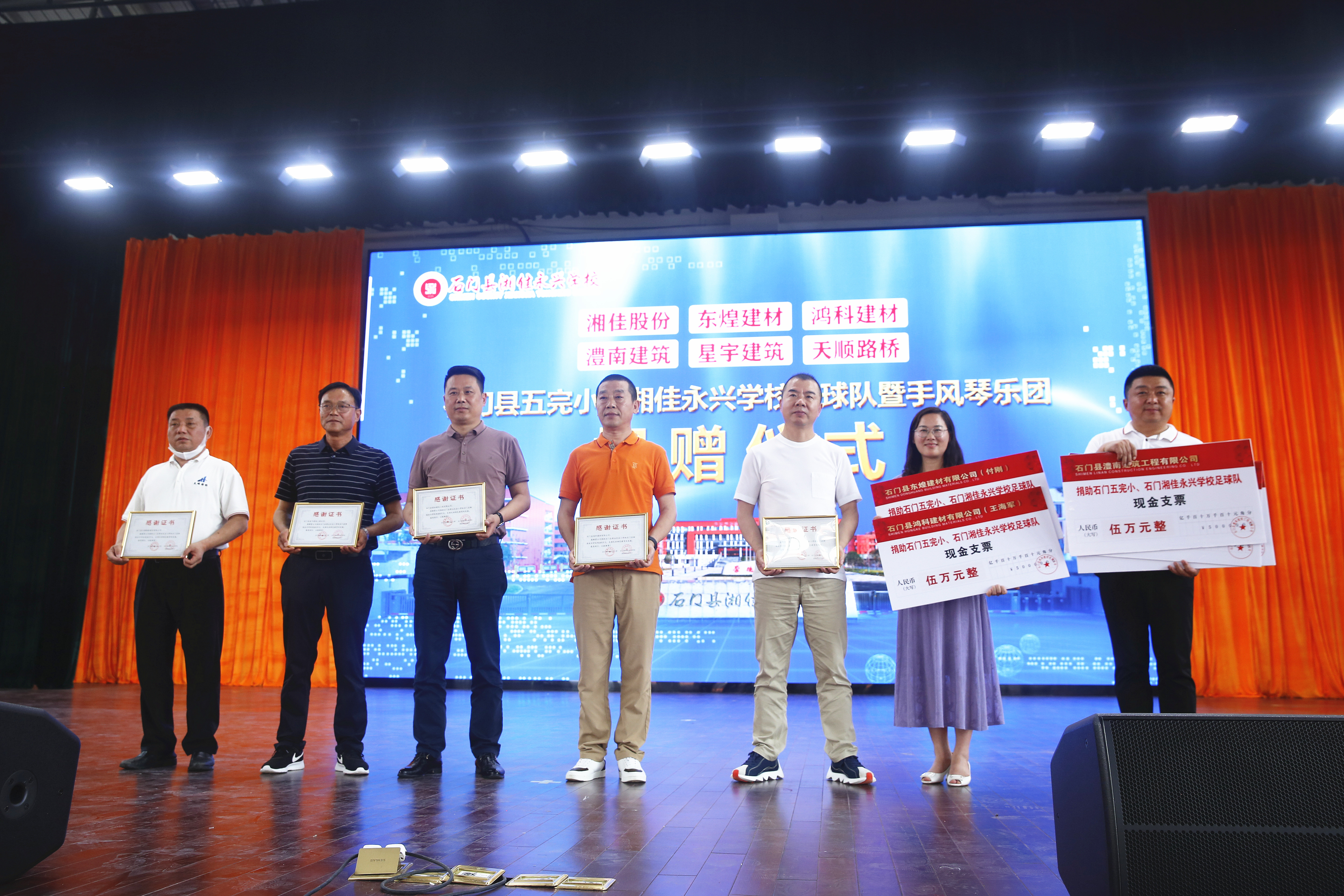 5月30日下午,湖南省石門縣五完小足球隊、湘佳永興學(xué)校手風(fēng)琴樂團(tuán)收到來自石門本土上市企業(yè)湘佳股份和石門本土知名企業(yè)東煌建材、鴻科建材、澧南建筑、星宇建筑、天順路橋捐贈的共計40萬元“厚禮”。