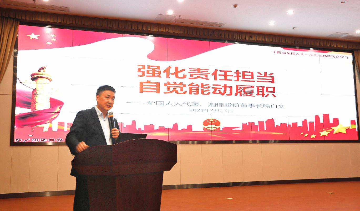 4月13日下午,全國人大代表、湘佳股份董事長喻自文在湘佳全產業鏈學院為石門縣部分人大代表宣講全國兩會精神。